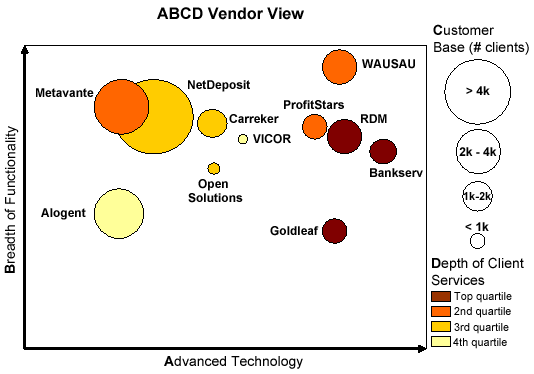 This report examines the offerings of eleven vendors: Alogent Corporation, BankServ, Carreker Corporation, Goldleaf Financial Systems, NetDeposit, Metavante Image Solutions, Open Solutions, ProfitStars, RDM Corporation, VICOR, and WAUSAU. The report uses a framework for evaluating vendors called the Celent ABCD Vendor View, which shows at a glance the relative position of each vendor in four categories: Advanced technology, Breadth of functionality, Customer base (number of end users), and Depth of client services.