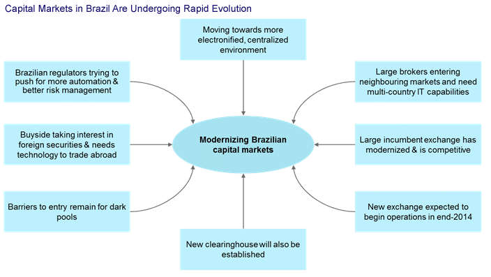 However, Brazilian capital markets are undergoing rapid modernization and have become more electronified and centralized in the last few years. The entry of large foreign brokers and vendors has improved the technological standards, and Brazil is now considered one of the leading emerging markets. New exchanges and clearinghouses are being created, and local sell side and buy side firms are upgrading their technology to become more competitive in the region.