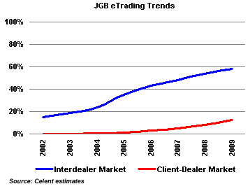 E-trading will rise from 35.2% of overall JGB trading in 2005 to 58% in 2009 in the interdealer cash market and will surge from only 1.1% in 2005 to 12.7% by 2009 in the client-dealer market, according to the report.