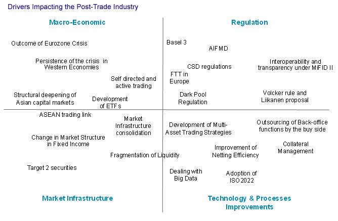 In the report Future of Post-Trade Industry, Part I: Identifying the Drivers of Change, Celent identifies different drivers that are likely to influence the future of the industry. The regulatory environment has undergone rapid changes in recent times. This has created additional obligations on the mid-back office processes, particularly in the areas of risk management, reporting, and regulatory compliance. In the evolving environment it has become essential that firms address the complete trade cycle in a much more holistic way, and many buy side and sell side firms are acting in that direction.