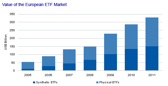 The European ETF market has grown steadily between 2005-2011. The share of the synthetic ETF market has also grown over this period, rising from around 21% in 2005 to more than 45% of the value of the overall European ETF market in 2011.