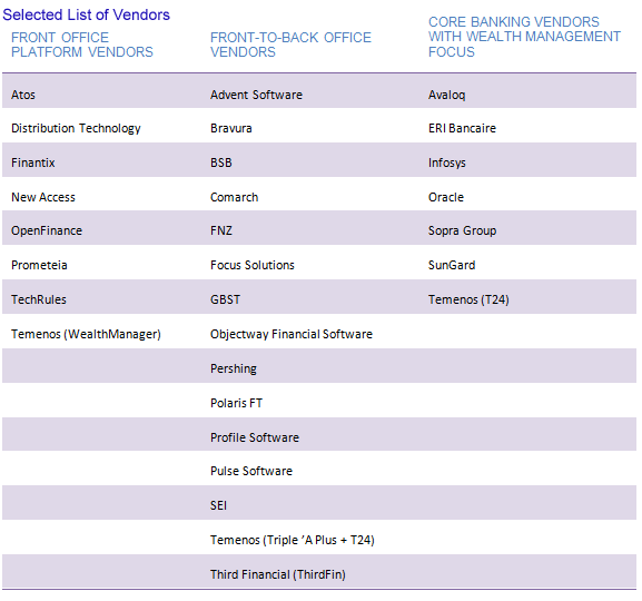 In the following two reports, Celent will focus on front-to-back office platforms and core banking vendors with wealth management offerings. These reports are titled European Wealth Management Technology Vendors: Evaluating Front to Back Office Vendors and European Wealth Management Technology Vendors: Evaluating Core Banking Vendors, respectively.