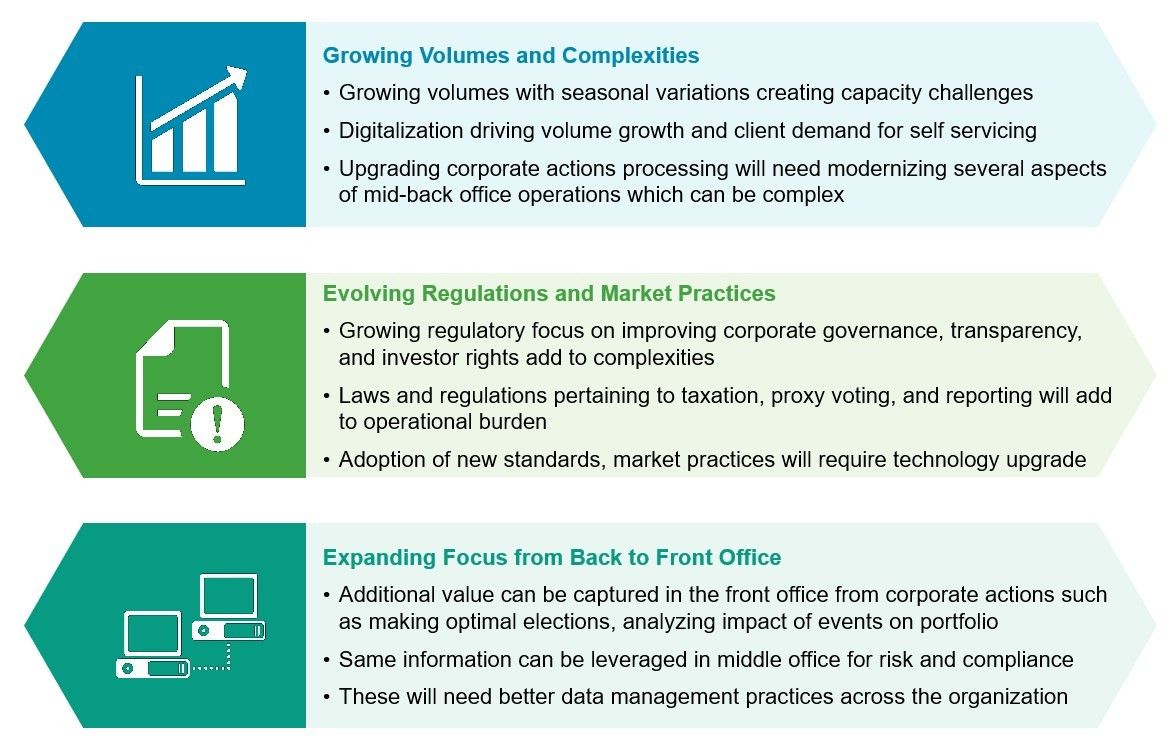 With growing volumes and complexities of corporate actions, intensifying regulatory scrutiny on transparency in corporate governance, and diminishing tolerance from regulators for errors by financial institutions, all intermediaries involved in corporate actions processing must improve their operations.
