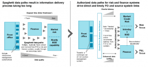 What is the best path forward?To accurately gauge the magnitude of this issue requires a firm awareness and comprehension of the facts, but today the management of risk and finance, processes, data, and technology are fragmented. This spaghetti-like situation and disparate nature of data routes and management systems slows business processes and obscures the reality of the issue itself. Action is urgently needed to establish data flows that cut across risk and finance as well as to create agile front office control and strive for enhanced portfolio optimization.