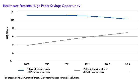 Fully electronic payments (EFTs) and 835s (electronic remittance advices) have made some inroads in displacing paper, opening the door for significant cost reduction. Given projected adoption rates, enhanced processing (i.e., capture, normalization, reconciliation, and posting) of electronic data has the opportunity to eliminate $3.8 billion of the $22 billion in total processing costs in 2009. With increased availability of electronic data, the potential cost savings are estimated to almost double to $7 billion by 2014.