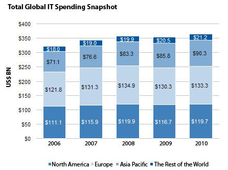 Among all regions, the fastest growth will be seen in financial services institutions in Asia-Pacific, with IT spending increasing at 8.9% in 2008 and a CAGR of 4.1% from 2008 to 2010. Growth will continue to rise in this region, and total spending in Asia-Pacific is expected to reach US$90.3 billion in 2010. Latin America and Africa are expected to grow at a relatively modest rate (3.1%). Spending in this region will grow to US$21.2 billion in 2010.