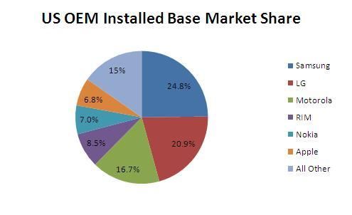If anyone was in doubt about Google's seriousness about mobile, those thoughts can now be laid to rest. Their $12.5 billion bet on mobile is reflective of the fact that Google sees about one in four of its searches starting from mobile. They also announced an agreement with Citi, MasterCard, First Data and Sprint for a payments and marketing initiative. One of the key issues around NFC payments is controlling the secure element. Owning Motorola gives them control of the device. And remember that while Apple might be leading the smartphone market, it is nowhere near the largest device manufacturer for the US market as shown below.