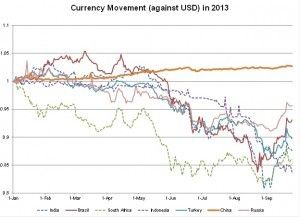 The main global factor that has contributed in the depreciation of these different currencies is the US Fed’s announcement in May of its plans to end of its bond buying program. This was an indication of economic recovery in the US which prompted international investors to withdraw investments in emerging markets and invest them back in the US. Fed’s latest announcement not to taper its bond buying program as early as was expected after its previous announcement saw many of these currencies somewhat appreciate against the US dollar in the last couple of weeks – this reinforces the argument that Fed’s actions largely determined the short term fluctuations in the Indian Rupee. A part of the depreciation in the value of Rupee was also driven by speculative activities in the currency market, especially in the offshore non-deliverable forwards (NDF) market. Couple of points are worth mentioning about the fundamental issues with the Indian Rupee. Even though the Rupee depreciated drastically since May, it has been in the decline for quite some time now, at least since 2011. So the depreciation of Rupee is not just a short term trend driven by global factors. India has had a current account deficit that has become wider in the aftermath of the global financial crisis as exports have failed to keep pace with imports due to economic slump in the west. This has been further exacerbated by rising oil prices as oil is an essential component in India’s total imports. Even though the government has taken measures to discourage buying of gold by the population – the second biggest contributor to the deficit – success in this regard has been moderate. These have resulted in a growing deficit that contributed to the Rupee’s fall in the medium-long term. The fact that the Rupee has depreciated not only against the US dollar, but also against other major currencies, is a testimony of this wider and longer term problem. For some time now India has been financing the current account deficit by the inflow of foreign portfolio investments. However, portfolio investments are highly volatile and can leave the country any moment. At times of crisis, the combined effect of a depreciating rupee and investment outflow exacerbate the problem, as was seen during the recent episode. The situation is further complicated by high external commercial borrowings by Indian corporates. Most of them borrowed heavily from international markets during the first half of the previous decade, and a substantial part of it is due for payment soon (around US$172bn or 60% of India’s total foreign reserves due by March 2014). Since the aftermath of the Asian financial crisis of 1997 many emerging countries, including India, have built up significant reserves to protect themselves from sudden fluctuations in their currencies. However, the country’s central bank did not intervene much in the currency market to stem the fall in the Rupee during the recent episode. The solution to prevent such situation in the future is twofold. Liberalization of financial markets has meant the currency is exposed to speculation in international markets, and increasingly to monetary policies of the US which has a fiat currency. Some form of capital control may be one way of stemming sharp currency swing in the short term. It is interesting to note that just over three years ago many of the emerging countries were voicing concerns that their currencies were appreciating too much due to strong short term international flows. This prompted the IMF, which was a proponent for free flow of capital for a long time, to reverse its position, and support some form of capital control for developing countries. While this can be an effective strategy in the short term, in the medium to longer India needs to cut down its current account deficit. Too much dependence on volatile foreign portfolio investments may not be the best way to go about it. Increasing foreign direct investments may be one way to increase flow of foreign capital that is less volatile. However, that is often a political decision and needs consensus from various stakeholders. Revaluating import policies may be another way to reduce dependency on import of non-essential items that can reduce the deficit. Data Source for the charts: Oanda.com