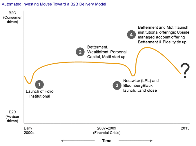 The shift toward a technology-driven means of investing has undercut the role of the advisor and exposed inherent weaknesses in the high-cost model of brokerage houses and registered investment advisors. Looking ahead, however, automated investment advisors will face a more rugged environment defined by tighter margins and competition from online brokerages (in many respects the natural competitors of the automated investment advisors) and institutional players such as Vanguard and Charles Schwab, which have built-in client bases and are better positioned to withstand an eventual market downturn.