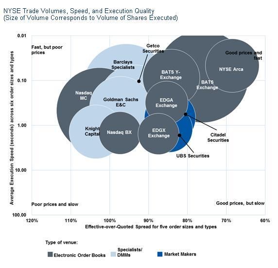 NYSE Arca is the leading market center, followed by the two BATS Exchanges. The firms that have performed well with regard to price include Citadel Securities and UBS Securities. Similarly, Barclays Specialists has been a strong performer when it comes to average execution speed.