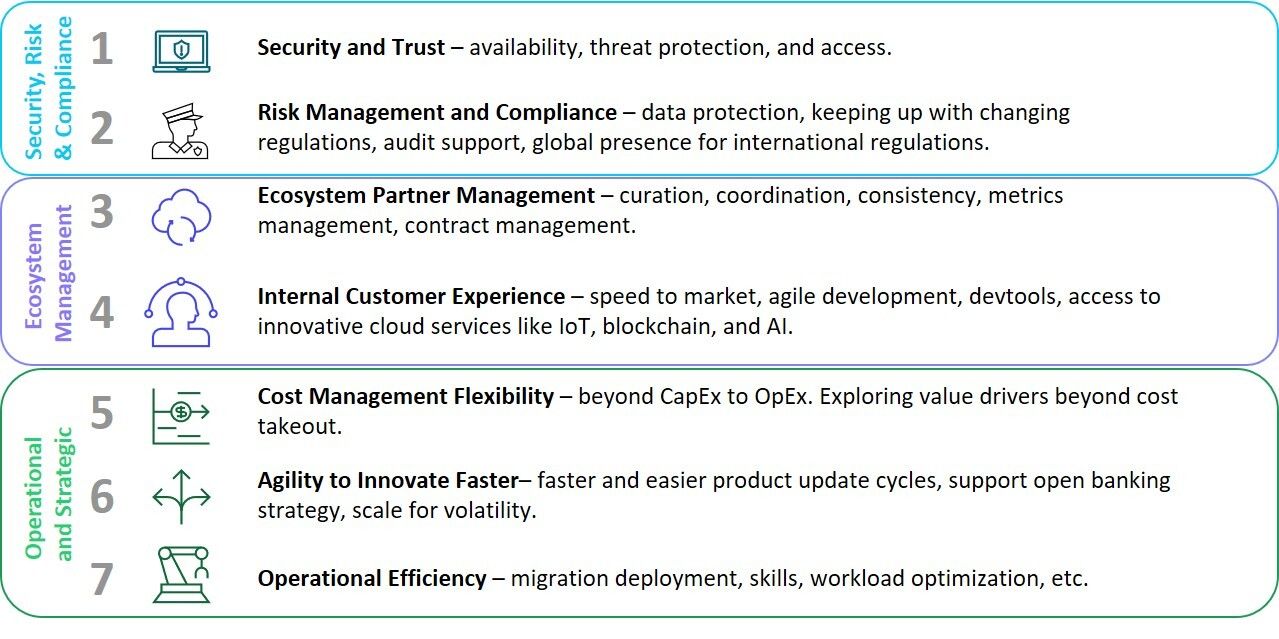 Public cloud adoption has been growing steadily in many industries. Financial institution (FI) cloud adoption has been slower, though, because these firms are heavily regulated due to the large amount of confidential financial customer information they possess. FI information security; risk and compliance; and ecosystem management, integration, and control preferences are exceedingly high. As a result, many banking applications in the public cloud today are not mission critical or do not directly expose core systems and databases.