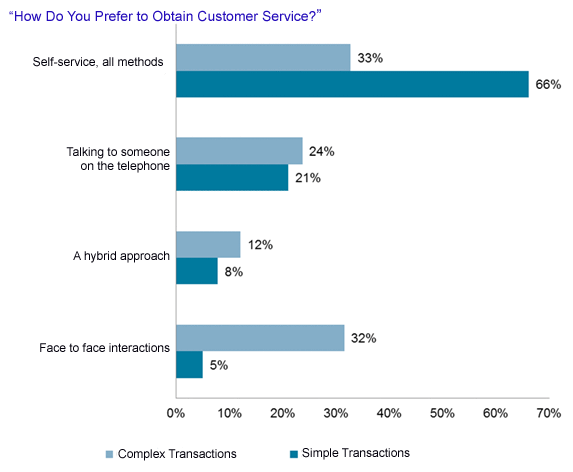 The data both supports and challenges commonly held assumptions about customer experience requirements. For example, consumers confirmed that they value self-service on the web for simple transactions. However, they also expressed a preference for performing complex activities for themselves as well, challenging the assumption that they usually want an intermediary involved.