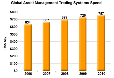 However, even with all this change, global spending will grow at a slower pace over the next few years. Prices have declined, and there is some market saturation. A compliment to the wide variety of systems and price points available, vendor consolidation, will likely continue as well as client consolidation. Total global spending by asset managers on trading systems will grow from US$634 million in 2006 to US$757 million by 2010, an average annual growth rate of 4.6%