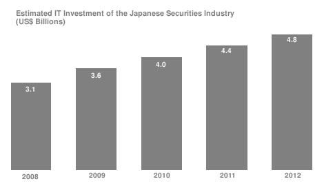 IT investment by the Japanese securities industry will continue to grow. Outlays for IT by Japanese securities firms will reach US$3.1 billion and US$4.8 billion in fiscal years 2008 and 2012.