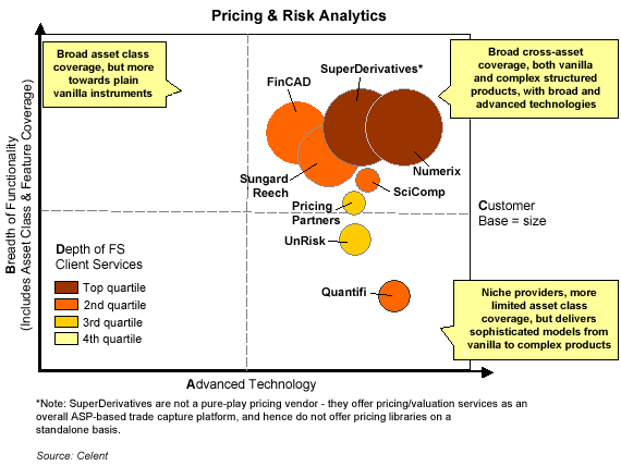 Eight firms are profiled in this report, which contains pertinent information about each vendor solution, including company and organizational details, solution strengths and drawbacks, reference feedback, market presence, and solution coverage. Vendors covered include FinCAD, NumeriX, Pricing Partners, Quantify Solutions, SciComp, SunGard Reech, SuperDerivatives, and UniRist / MathConsult.