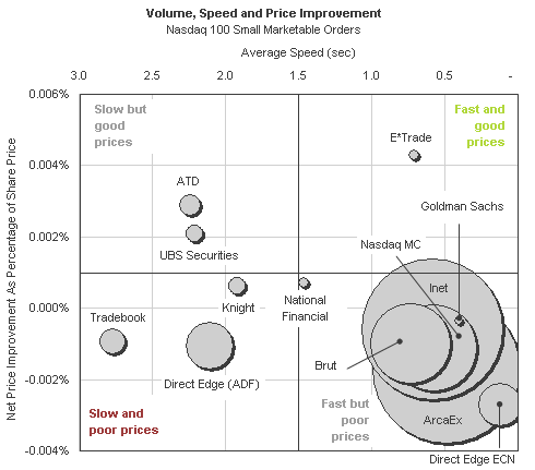 In general, electronic communication networks (ECNs) offered the fastest execution times, but market makers offered significantly more price improvement. However, for larger orders, ECNs were actually able to outperform market makers for price as well.
