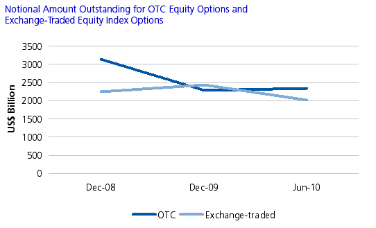 During the period between December 2008 and June 2010, there were declines in both notional amount outstanding for OTC equity options and exchange-traded equity index options. But the decline was more pronounced for OTC options, from US$3,154 billion to US$2,328 billion, around 26%. In the same period, exchange-traded equity options declined by about 10%, from US$3,034 billion to US$2,236 billion. This shows that there was greater resilience in the exchange-traded market.