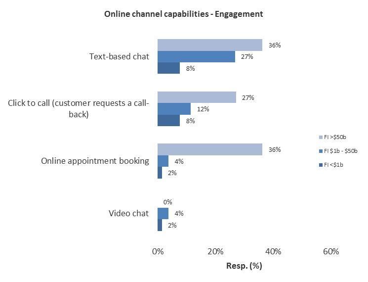 Source: Celent survey of North American financial institutions, October 2014, n=156 Even better would be to extend the appointment booking option to digital channels, as a phone or telepresence conversation. Engagement doesn’t have to be limited to face-to-face interactions – but is, in all but the largest banks. In the same survey referenced earlier, just 20% offered text based chat online, 12% offered click-to-call and 2% offered video chat.