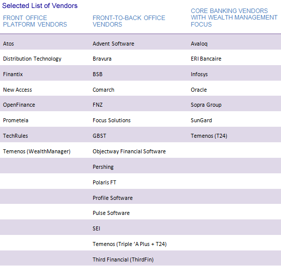 The European technology market is a crowded one. Celent breaks vendors into three distinct categories: front office platform providers, front-to-back office providers, and core banking providers. This report features vendors that focus on providing core banking platforms for wealth management.