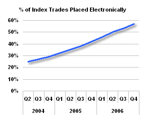 Approximately 25 percent of all trades of credit indices are now placed electronically, and that number will approach 50 percent by 2007, but at least a year will pass before the infrastructure will be in place for credit derivatives to be traded electronically on a large scale. Credit default swaps will not be traded electronically to a significant degree until at least the early part of 2006, when they will be sufficiently standardized and liquid.