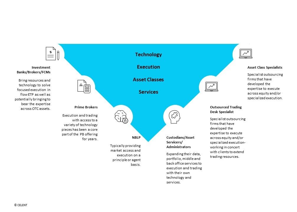 The pressure on the buy side is intense . On the journey to managing operational and regulatory demands in a cost-effective way, investment management firms have already outsourced many of the functions of their back and middle offices. Today, for some firms, even the once untouchable front office is in play. In this report, we look at the trends and implications of the delivery of technology and services to the buy side in this shift to outsourced models. We explore the rationale for this shift, demand drivers, and the changing provider universe. In order to collect data and benchmark views, Celent spoke to a number of global asset managers and hedge funds that are considering or have already outsourced their trading function. Most had a mixture of asset classes but leaned toward equity. We also spoke to outsourcing providers, prime brokers, and technology providers active in this area.