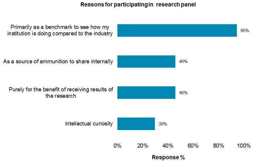 This question comes up often. As a research and advisory firm, Celent fields ad-hoc research with regularity. No matter how well thought out our surveys, however, we nearly always wish we could have asked additional questions. This led us to launch two research panels focused on topics representing significant and growing interest among Celent clients. The purpose of the effort is to look deeply into the objectives, priorities, risks, barriers, and likely outcomes of two seminal retail banking topics in North America. Specifically: • Digital Banking • Branch Channel Transformation Both panels consist of bank and credit union leaders with significant interest and involvement in one or both of these topics, willing to invest in bi-monthly surveys and interactive webinars in return for complimentary access to the resulting Celent reports. Many are not Celent clients and would not otherwise have access to the research. Why are they doing this? We asked that question in a recent survey. Virtually all panel members are involved primarily as a benchmark to see how their institution is doing compared to the industry overall. It’s highly useful and timely insight for those involved (see below). Perhaps you’d like to join us. You could have compelling and timely benchmarks for your financial institution. Celent is accepting additional requests for membership in the Branch Transformation and Digital Banking Research Panels and expects to field ongoing research through 2016 at semi-monthly intervals. To request to be on one or both panels, apply Here. [caption id="attachment_5106" align="aligncenter" width="583"]