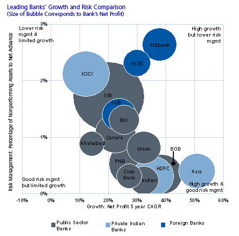 Banks such as Axis Bank, Bank of Baroda, HDFC Bank, Union Bank, and Indian Bank perform well because they have high growth rates with a low ratio of Nonperforming Assets (NPAs) to Net Advance. Some banks that should work towards reducing the ratio of NPAs to Net Advance are Citibank, HSBC, ICICI Bank, and SBI.