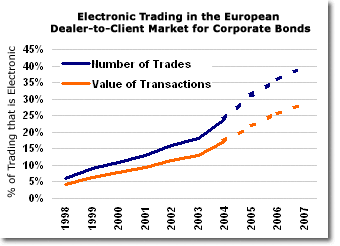 | Paris, France May 31, 2005 The growth of liquidity in the dealer to client corporate bond market has benefited electronic platforms; today these account for 24% of all transactions. Celent anticipates that by 2007, 40% of trades will be conducted electronically accounting for 28% of the volume. In a new report, " ," Celent examines the European dealer-to-client corporate bond market, and analyzes how this market is turning to electronic trading. The report provides detailed information on market structure, expected growth, and challenges ahead. ![]() According to Axel Pierron, Celent Analyst and author of the report "Electronic trading in the European dealer-to-client corporate bond market has clearly gained momentum during the past two years. The narrowing of the spread has encouraged investors to use electronic platforms, and they have experienced the added value provided by electronic processes such as better management of post-execution information or decrease of error rate." While single-dealer sites still attract a majority of electronic trades, multi-dealer systems are gaining ground. Currently, close to 50% of electronic transactions are conducted via single-dealer sites. Pierron adds, "the implication/commitment of institutional investors to electronic trading and the development of new functionalities on multi-dealer platforms could clearly change the situation. The strong volume growth of MarketAxess Europe, the only platform really dedicated to credit debt instruments, shows that investors recognize the value provided by multi-dealer platform in the D2C corporate bond market". The report closely examines MarketAxess, Bondvision, Bloomberg, and the exchanges offering services in the dealer-to-client corporate bonds arena. The 34-pages report contains 17 figures and 3 tables. | of Celent's Retail Securities & Investments research service can download the report electronically by clicking on the icon to the left. Non-members should contact info@celent.com for more information. |