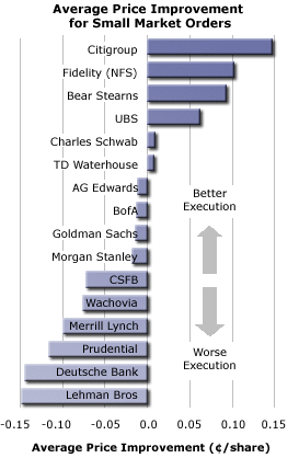 The report examines in detail the execution quality of 16 leading US brokerage firms: AG Edwards, Bear Stearns, Banc of America, Charles Schwab, Citigroup, CSFB, Deutsche Bank, Goldman Sachs, Lehman Brothers, Merrill Lynch, Morgan Stanley, NFS (Fidelity), Prudential, TD Waterhouse, UBS, and Wachovia. Execution quality was measured using a number of criteria, including speed of order execution and prices achieved for clients. Data used in the report come from the second quarter of this year. The table below shows the top three firms overall as well as those ranked tops for prices and execution speed.
