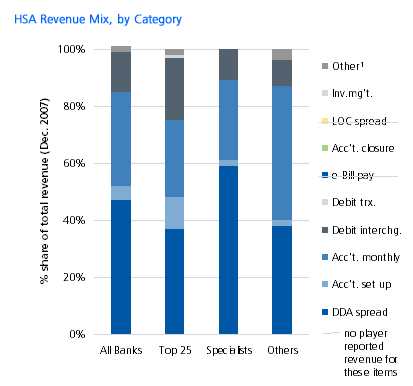 On the surface, the HSA market appears to be highly appealing for banks: from December 2006 to January 2008, accounts grew by 73%, while total balances grew by 140%. However, from a bank internal perspective, the picture is not so clear, as income per account ranges from $60 to $100. Banks' varying revenue and cost structures indicate that the HSA market is still in a "pre-shakeout" stage, awaiting the bifurcation of market players into "manufacturers" and "distributors."