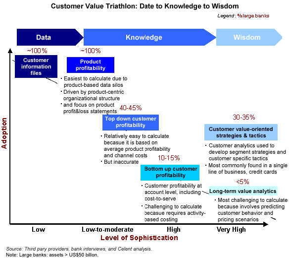 The power of traditional retail banking strategies is waning. Diversification and acquisition strategies are being tapped out, new branch growth is increasingly expensive, and market share is continually being nibbled away by new entrants. Where does the performance power now lie? Celent believes the answer is in customer value management. No small feat, customer value management involves a customer analytics triathlon that begins with mastering customer data, moves to achieving knowledge (extracting insight from the data, e.g., customer profitability), and culminates in realizing wisdom (acting on the insight, e.g., using predictive modeling to improve sub-segment profitability). The triathlon has proven to be an Olympian feat with few in the bank pack able to finish the race today.