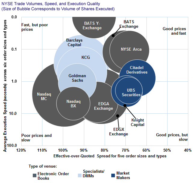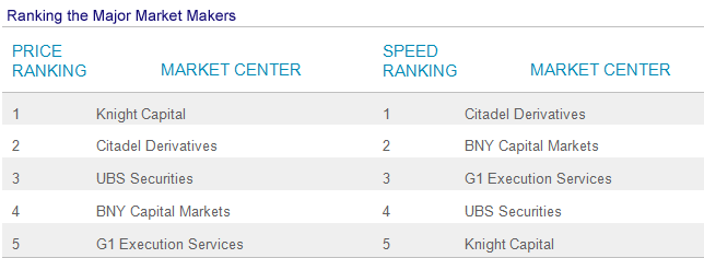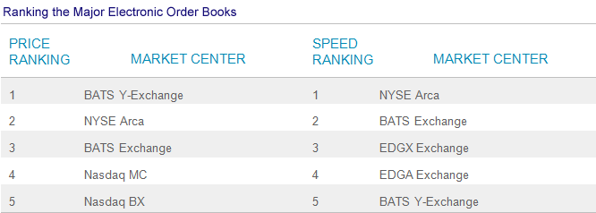 NYSE Arca, BATS Exchange, and Citadel Derivatives are the market centers that are performing well with regard to both execution speed and price improvement. UBS Securities, Knight Capital and BATS Y-Exchange are some of the other leading performers.