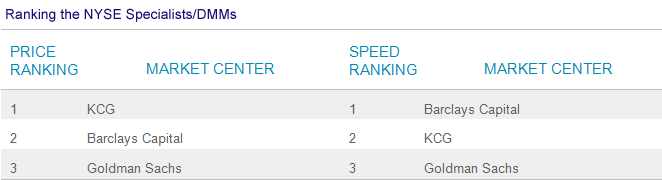 In the exchange specialists/DMMs category, KCG, Barclays Capital and Goldman Sachs are the leading performers with regard to price improvement. Similarly, Barclays Capital, KCG, and Goldman Sachs are the best-performing firms for the average speed of execution.