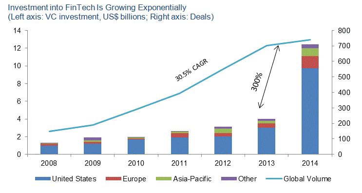 In 2010, investment in the Fintech space totaled less than $2 billion. More than $12 billion went into FinTech in 2014.