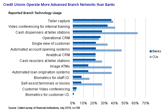 “Most financial institutions are under considerable pressure to both reduce costs and improve branch sales and service effectiveness,” says Bob Meara, Senior Analyst with Celent’s Banking Group and author of the report. “Credit unions appear to be way ahead of banks in terms of having invested in technologies to help bring this about. Banks have lots of catching up to do.”
