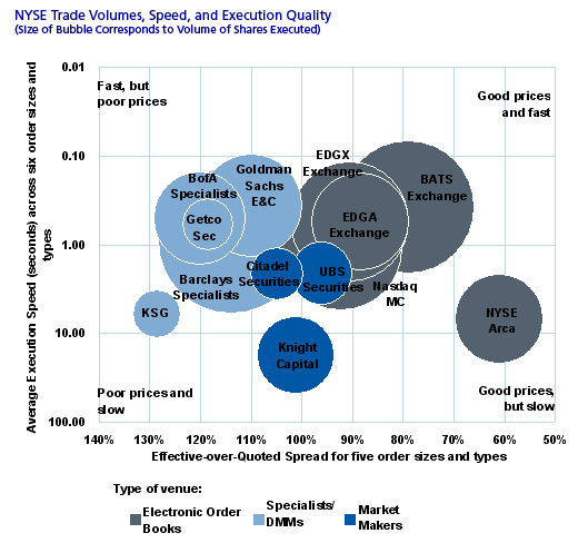 Table 1 gives the overall rankings for the leading venues of the NYSE issues. The price rankings are headed by Liquidnet and LeveL ATS, whereas the speed rankings are headed by BATS Exchange and KSG.