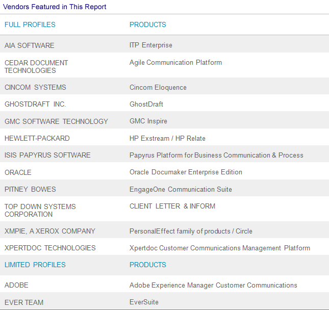 This report profiles 14 document automation systems, with 12 full profiles, and two shorter profiles. Each profile presents information about the vendor and solution; customer base and reference customer feedback; functionality; technology, implementations, and cost; and some summary comments.