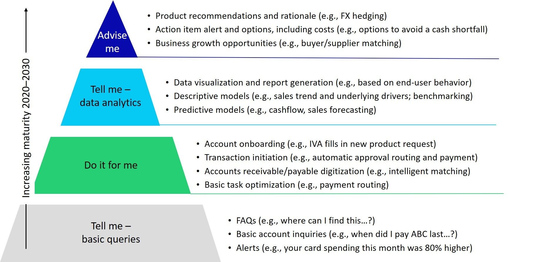 Small business banking is ripe for disruption as evidenced by the onslaught of fintech and big tech players vying to capture traditional as well as new revenue streams. The winners over the next decade will not look like today’s banks. Already, the pacesetters are achieving step change by taking a customer-centric approach and delivering easier financial workflows, simple smart analytics, and actionable advice. To generate a sustainable competitive advantage in this heated competitive environment, however, banks must go beyond step change and realize game changing moves. A few are beginning to change the game entirely by applying AI at scale to personalize customer support and deliver advanced analytical tools and actionable insights. They are moving beyond foundational AI applications (e.g., “Tell me”) to apex applications (e.g., “Advise me’).
