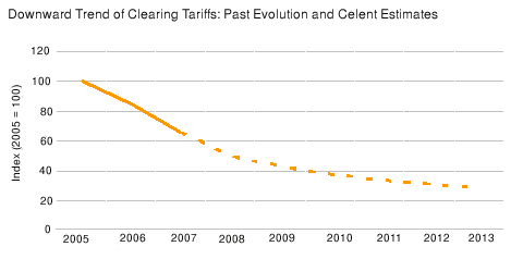 Nevertheless, on the central clearing counterparties side, the competition on price unleashed by the Code of Conduct is likely to continue, driving clearing fees even lower. Celent estimates that clearing fees should stop decreasing once they reach what is called the "switching cost"...that is, the point at which it is not profitable for customers to switch from one post-trade provider to another.
