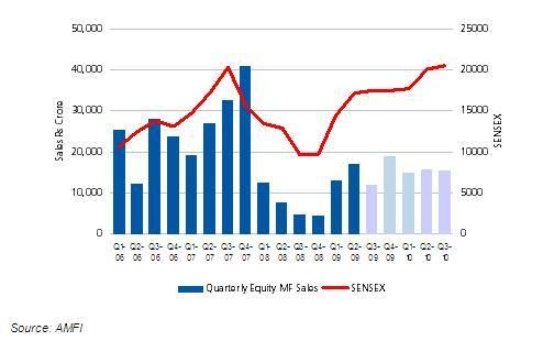 According to data from AMFI, quarterly sales have been steady since the second quarter of 2009, and higher than they were in 2008. However, one needs to decouple the effects of the crisis that hit the markets in 2008. From the figure, one can conclude that though equity fund sales grew after the rule change, they are still far below the trends observed during 2006–2007. The decline in 2008 was due to market conditions, but subsequent recovery has not been commensurate with overall market improvement. Equity fund sales moved in tandem with SENSEX in the pre-2008 period, but post-2008 the gap has widened.