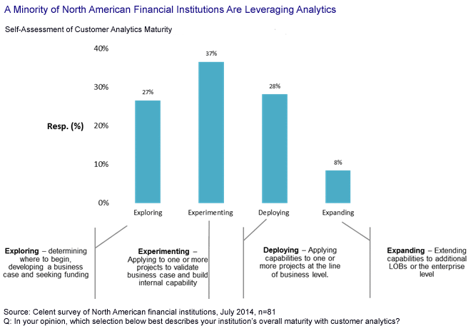 Data analytics is a complex subject and a complex undertaking. In the report Customer Analytics Adoption in Banking: When Management Doesn’t Lead, Celent examines the growing role of customer analytics (predictive analytics applied to customer data) in banking and why it is increasingly important. Despite this, two-thirds of surveyed North American banks are still exploring or experimenting with customer analytics.