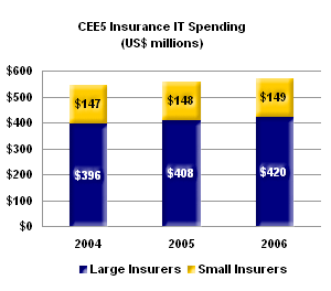 CEE5 insurers are expected to spend US$543 million on IT in 2004. Over the next two years, this number will grow slowly: Celent anticipates that in 2006, CEE5 insurers will spend US$569 million on IT initiatives.