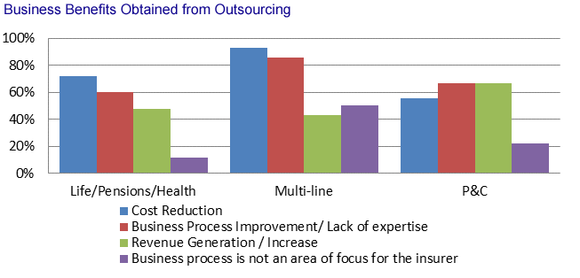 Cost reduction is not a predominant driver for business process outsourcing. “Cost reduction and business process improvement are top benefits for life insurers and multiline insurers,” says Karen Monks, Analyst with Celent’s Insurance Group and coauthor of the report. “Revenue generation and business process improvement are top benefits for property and casualty insurers.”