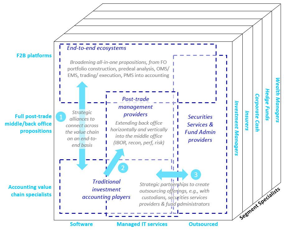 In recent years, next-generation technology solutions and availability of ‘at-scale' sourcing options for the buyside have expanded, with managed services, hosted solutions, and outsourcing becoming more mainstream. Shifting end-user demands toward fewer strategic vendor relationships will pressure vendors to connect more broadly with other providers in the value chain and to form/extend partnerships in order to pre-package and pre-bundle their offerings in conjunction with others (e.g., for esoteric asset pricing models, conventional and alternative datasets, news/sentiment, AI-powered analytics). Here, modularization enables the unbundling/rebundling of products/services, and interoperability (e.g., through microservices, Open APIs) can help facilitate collaborative partnerships, by employing modularized offerings to create new propositions and innovations.