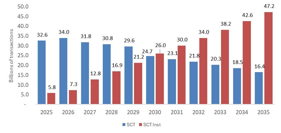 • By 2035, most credit transfers will be instant: every institution expects that at least two-thirds of SCT volumes will become SCT Inst, with an average of 75% of all SCT volumes.