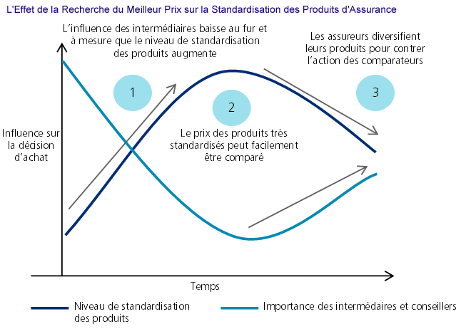 “L’effet de la recherche du meilleur prix sur le niveau de standardisation des produits peut remettre en question le rôle de certains intermédiaires de vente et notamment les personnes dont la proposition principale est de fournir un conseil aux consommateurs sur les produits d’assurance” écrit Nicolas Michellod, analyste senior dans le groupe assurance de Celent auteur du rapport, et “ le facteur déterminant pour les assureurs en vue d’analyser l’évolution du marché de l’assurance automobile en ligne et de décider quelle stratégie est la plus pertinente est le rôle des comparateurs ” ajoute-t-il.