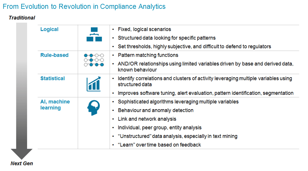リスク管理とコンプライアンス対応は、今や金融事業における最も重要な分野の1つとなりました。直近の10年をかけて、規制当局や政府が、市場の透明性や安全性、そして安定性を向上させるために、リスクの軽減を重視してきたためです。またこの流れに伴い、金融犯罪コンプライアンスの対象範囲は拡大し続けています。銀行の伝統的なコンプライアンス業務には多くの欠点があります。 AML技術が依存しているルールベースの分析手法は、主観的で、非常に静的で、事前定義されたものであり、またアップデートに大きな労力を要するものです。この結果、誤検知が高くなるため、大きな課題となっています。