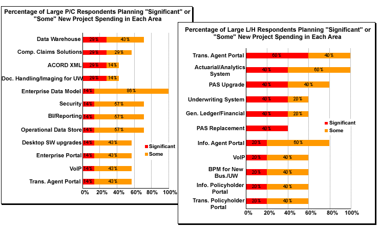 Top areas of significant new project spending vary by size and sector, but include initiatives focused on underwriting, claims, product development, and data mastery. Document handling, policy administration system replacement, ACORD XML adoption, and agent portals, and BPM all show up among the most common areas of significant new project spending. The report lists the top areas of "significant" and "some" new project spending by four size-and-sector groups of insurer respondents.