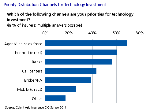 “There is increased spending on distribution this year,” says Wenli Yuan, Senior Analyst with Celent's Asia Financial Services Group and coauthor of the report. “The major channel priority for technology investment is still agent/tied salesforce. With regard to technology investment, Internet, bank, and mobile channels are more important to Asian insurers compared to 2010.”
