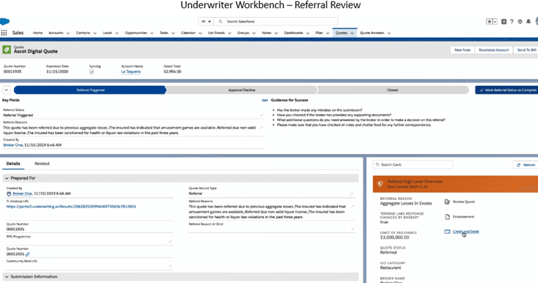 Believing that “if an underwriter spends more than 10-15 minutes on a submission, both Ascot and the broker will lose money on those accounts,” Ascot decided to develop a solution, Ascot Array. Ascot Array enables automated portfolio underwriting, which it defines as a process which mitigates human bias, and allows for a structured designed process to evaluate submissions quickly and efficiently.